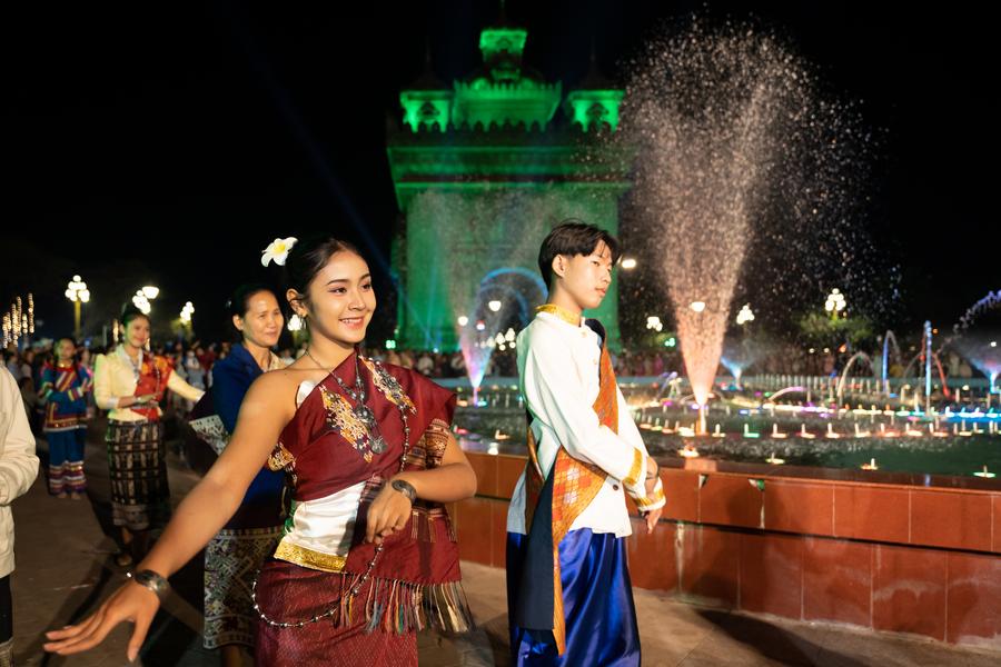 People participate in a New Year celebration at the Patuxay Park in Vientiane, Laos, Dec. 31, 2024. (Photo by Kaikeo Saiyasane/Xinhua)