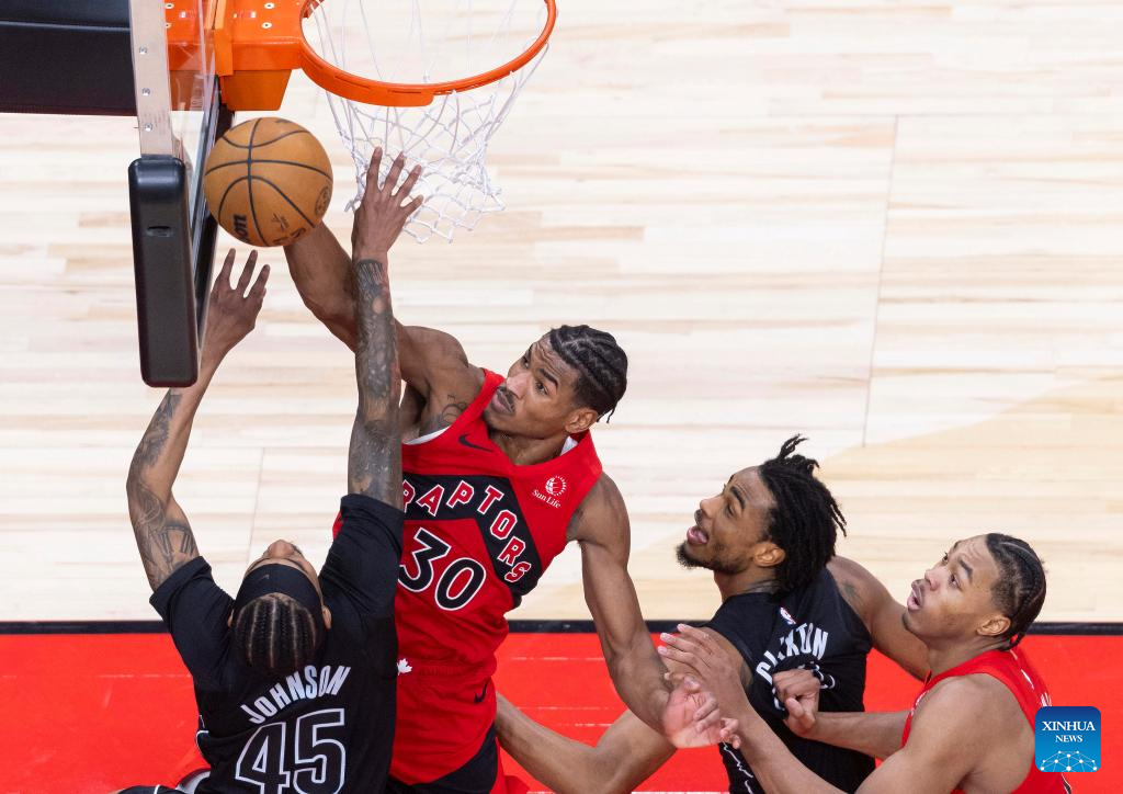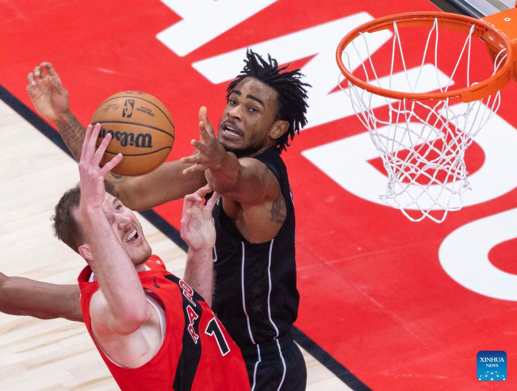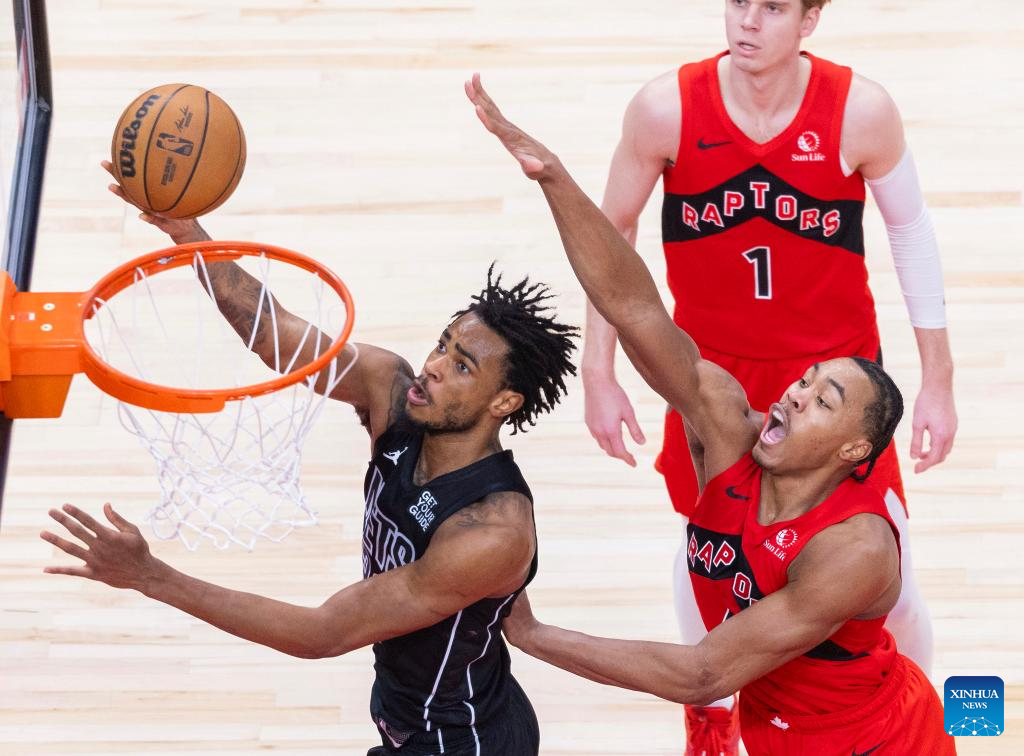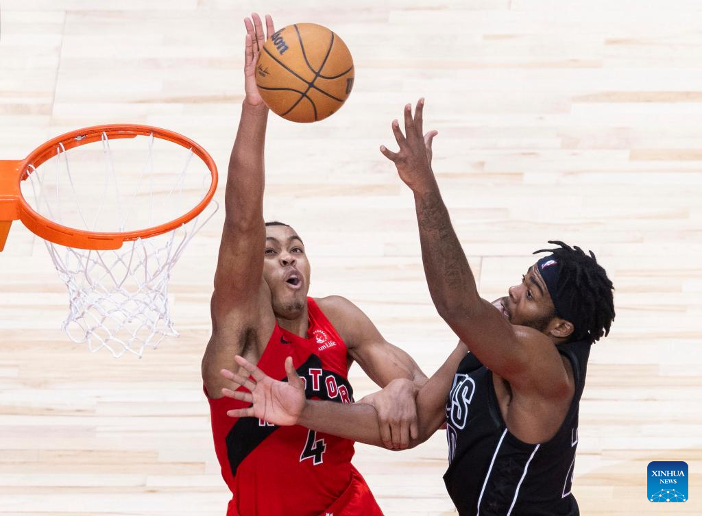 Ochai Agbaji (2nd L) of Toronto Raptors blocks Keon Johnson of Brooklyn Nets during the 2024-2025 NBA regular season game between Toronto Raptors and Brooklyn Nets in Toronto, Canada, Jan. 1, 2025. (Photo by Zou Zheng/Xinhua)