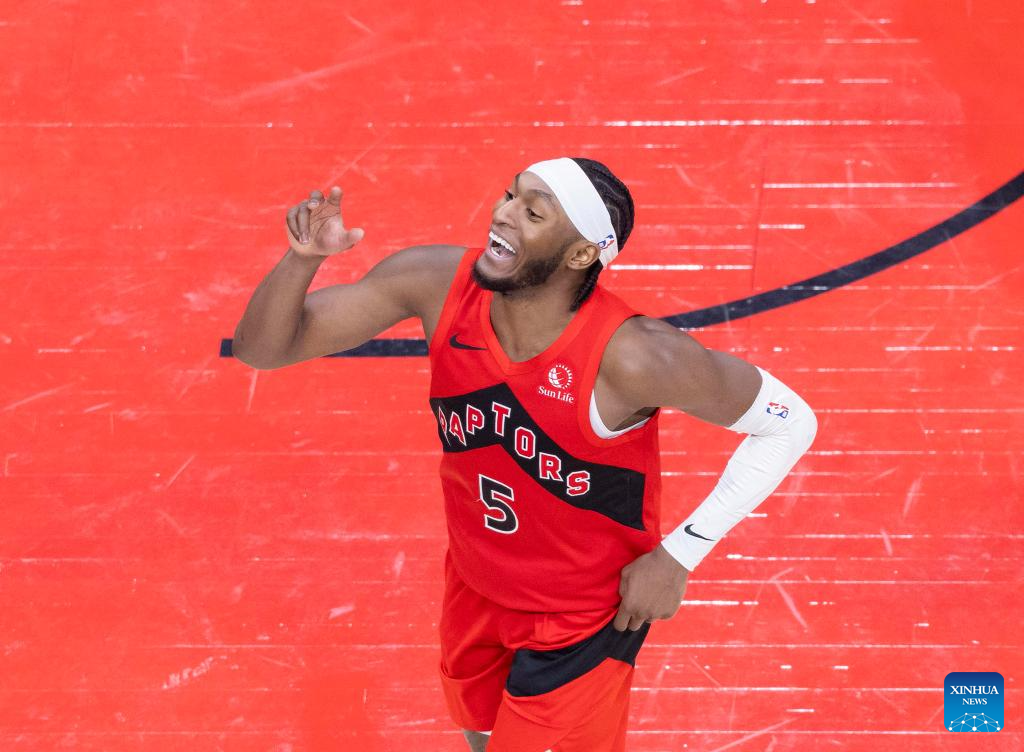 Immanuel Quickley of Toronto Raptors celebrates scoring during the 2024-2025 NBA regular season game between Toronto Raptors and Brooklyn Nets in Toronto, Canada, Jan. 1, 2025. (Photo by Zou Zheng/Xinhua)