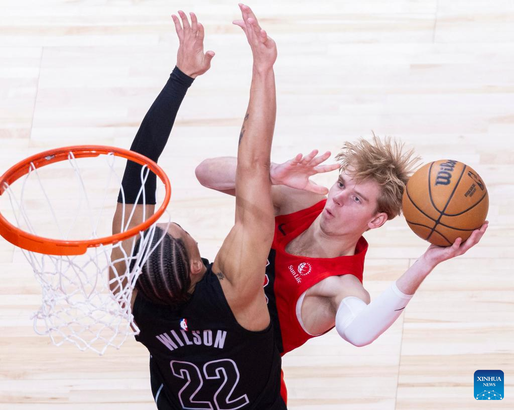 Gradey Dick (R) of Toronto Raptors makes a layup during the 2024-2025 NBA regular season game between Toronto Raptors and Brooklyn Nets in Toronto, Canada, Jan. 1, 2025. (Photo by Zou Zheng/Xinhua)