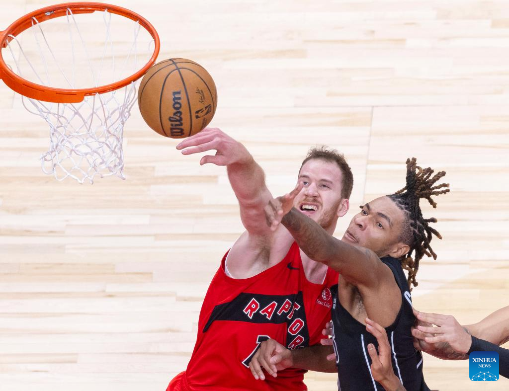 Jakob Poeltl (L) of Toronto Raptors fights for a rebound with Nic Claxton of Brooklyn Nets during the 2024-2025 NBA regular season game between Toronto Raptors and Brooklyn Nets in Toronto, Canada, Jan. 1, 2025. (Photo by Zou Zheng/Xinhua)