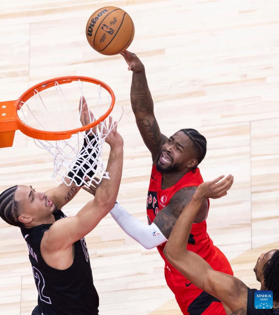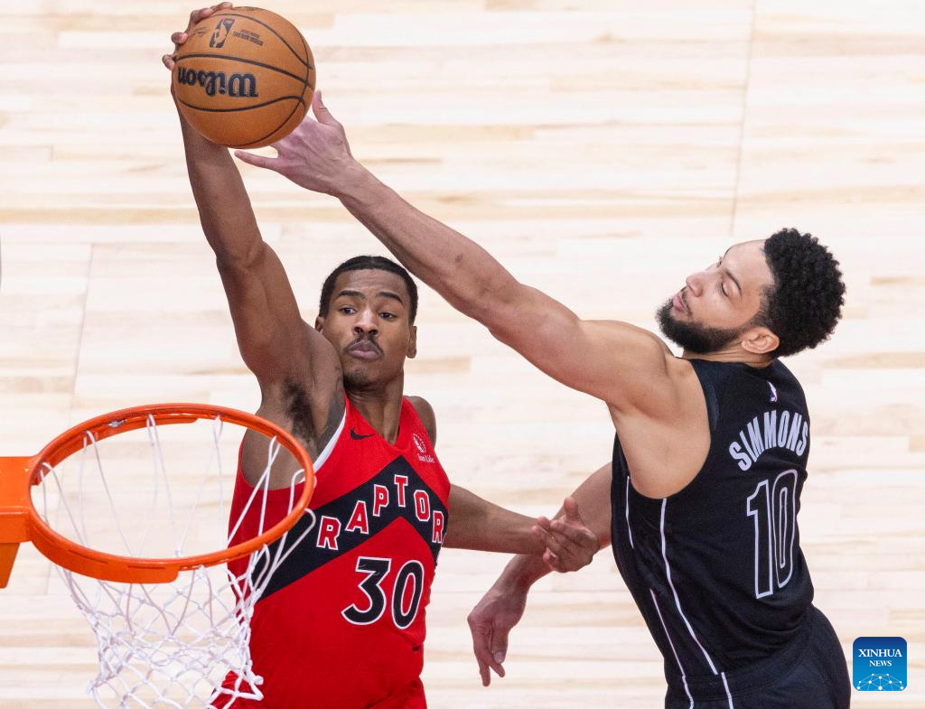 Scottie Barnes (L) of Toronto Raptors blocks Day'Ron Sharpe of Brooklyn Nets during the 2024-2025 NBA regular season game between Toronto Raptors and Brooklyn Nets in Toronto, Canada, Jan. 1, 2025. (Photo by Zou Zheng/Xinhua)