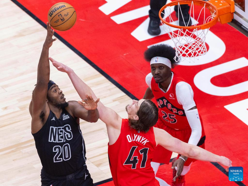 Day'Ron Sharpe (L) of Brooklyn Nets shoots the ball during the 2024-2025 NBA regular season game between Toronto Raptors and Brooklyn Nets in Toronto, Canada, Jan. 1, 2025. (Photo by Zou Zheng/Xinhua)