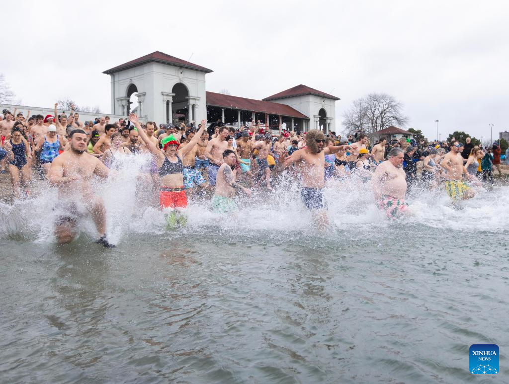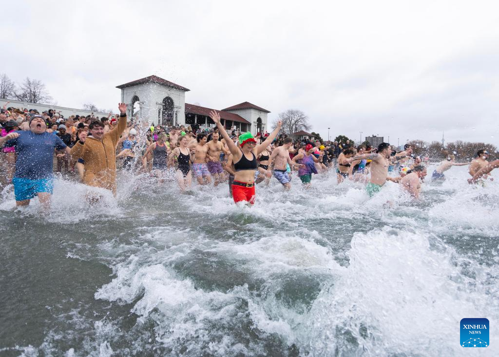 Participants wade in Lake Ontario during the Toronto Polar Bear Dip event in Toronto, Canada, on Jan. 1, 2025. Hundreds of people braved the chilly waters here on Wednesday to celebrate the first day of 2025 and raise funds for charity. (Photo by Zou Zheng/Xinhua)