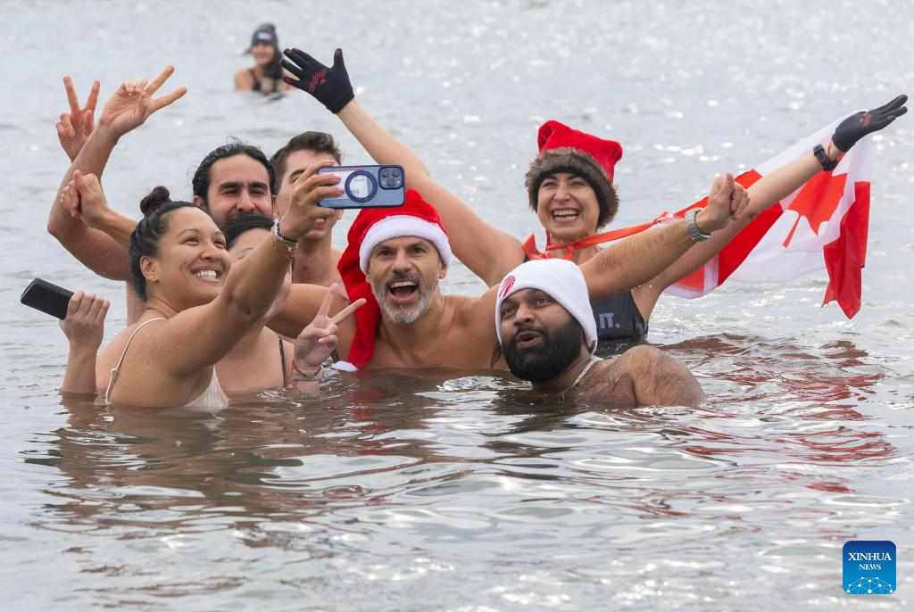 Participants pose for a selfie in Lake Ontario during the Toronto Polar Bear Dip event in Toronto, Canada, on Jan. 1, 2025. Hundreds of people braved the chilly waters here on Wednesday to celebrate the first day of 2025 and raise funds for charity. (Photo by Zou Zheng/Xinhua)