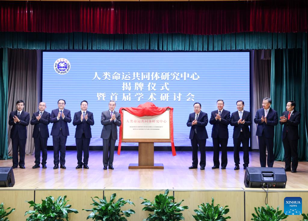 Wang Yi, member of the Political Bureau of the Communist Party of China (CPC) Central Committee and Chinese foreign minister, unveils the nameplate of the Research Center on Building a Community with a Shared Future for Mankind during the inaugural ceremony of the research center in Beijing, capital of China, Jan. 2, 2025. The research center was officially inaugurated here on Thursday. (Xinhua/Pang Xinglei)