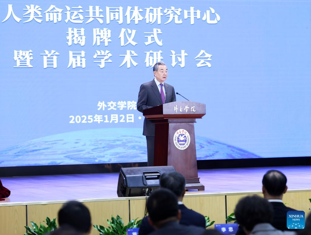 Wang Yi, member of the Political Bureau of the Communist Party of China (CPC) Central Committee and Chinese foreign minister, delivers a speech at the inaugural ceremony of the Research Center on Building a Community with a Shared Future for Mankind in Beijing, capital of China, Jan. 2, 2025. The research center was officially inaugurated here on Thursday. (Xinhua/Pang Xinglei)
