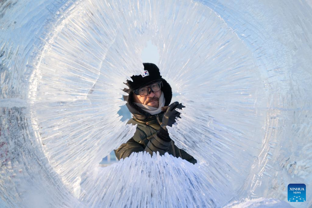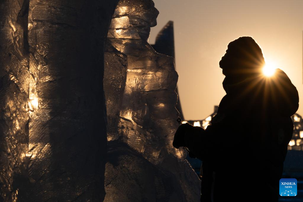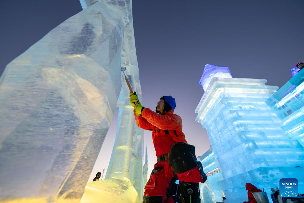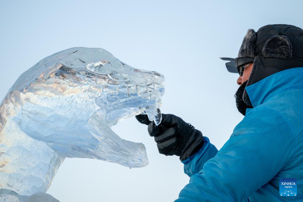 A competitor works on an ice sculpture during the 36th China Harbin International Ice Sculpture Competition at Harbin Ice-Snow World in Harbin, northeast China's Heilongjiang Province, Jan. 3, 2025. A total of 30 teams from 12 countries and regions participated in the competition. (Xinhua/Zhang Tao)