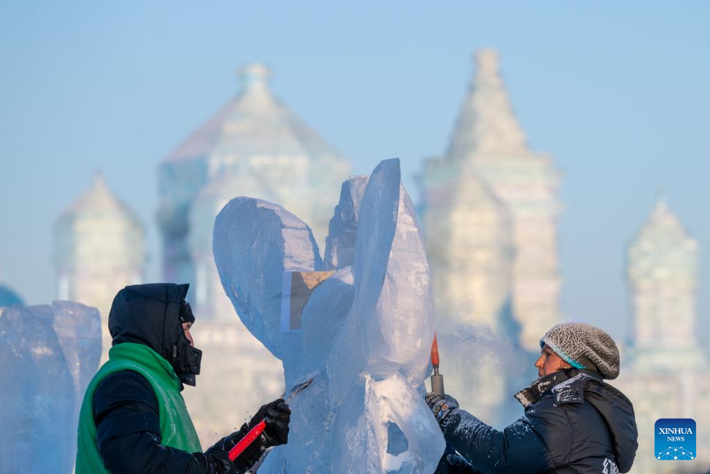 Competitors work on an ice sculpture during the 36th China Harbin International Ice Sculpture Competition at Harbin Ice-Snow World in Harbin, northeast China's Heilongjiang Province, Jan. 3, 2025. A total of 30 teams from 12 countries and regions participated in the competition. (Xinhua/Zhang Tao)