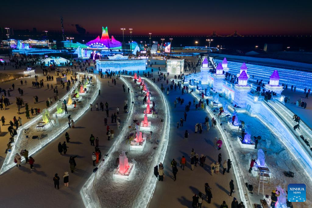 In this aerial drone photo, competitors work on ice sculptures during the 36th China Harbin International Ice Sculpture Competition at Harbin Ice-Snow World in Harbin, northeast China's Heilongjiang Province, Jan. 3, 2025. A total of 30 teams from 12 countries and regions participated in the competition. (Xinhua/Zhang Tao)