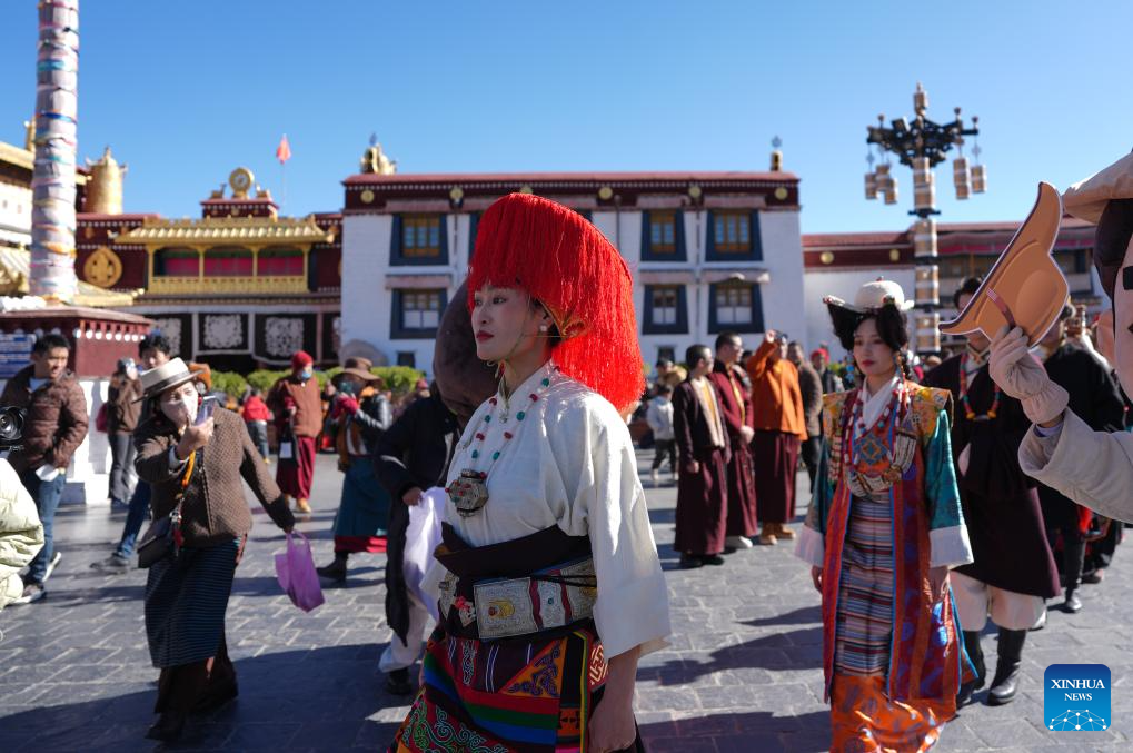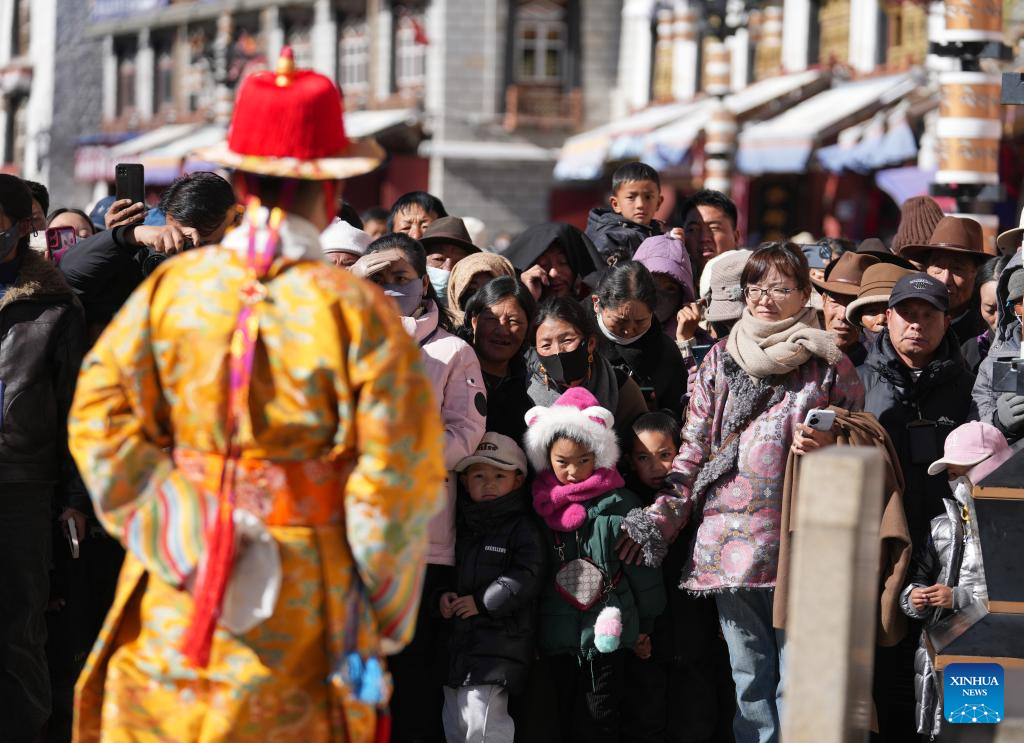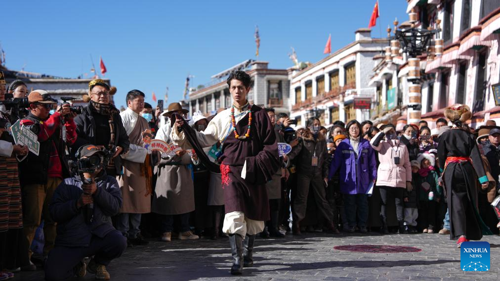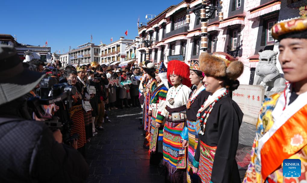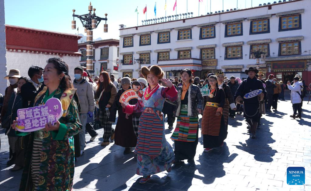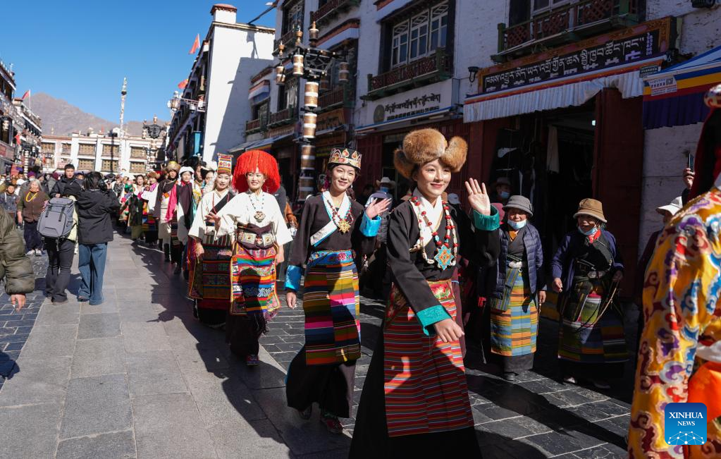 Models wearing traditional Tibetan costumes take part in a parade on Barkhor Street in Lhasa, southwest China's Xizang Autonomous Region, Jan. 3, 2025. The parade, part of a New Year costume show, was held here on Friday. (Xinhua/Jigme Dorje)