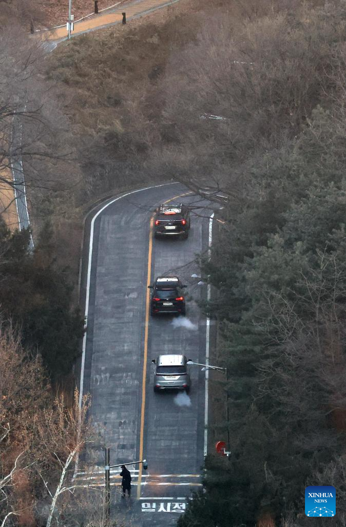 This photo taken on Jan. 3, 2025 shows cars carrying South Korean investigators running on the way to the presidential residence in central Seoul, South Korea. A group of South Korean prosecutors and investigators of the anti-corruption investigative unit launched an attempt to arrest the impeached President Yoon Suk-yeol, multiple media outlets said Friday. (NEWSIS via Xinhua)