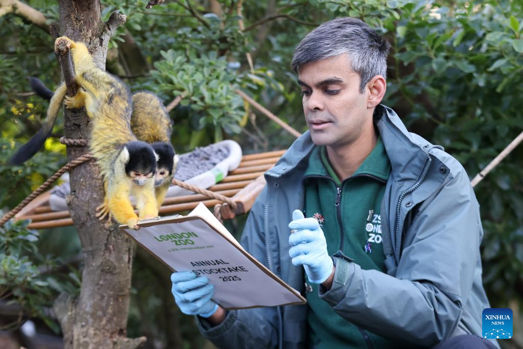 A keeper counts squirrel monkeys during the annual stocktake at London Zoo in London, Britain, Jan. 3, 2025. (Xinhua)