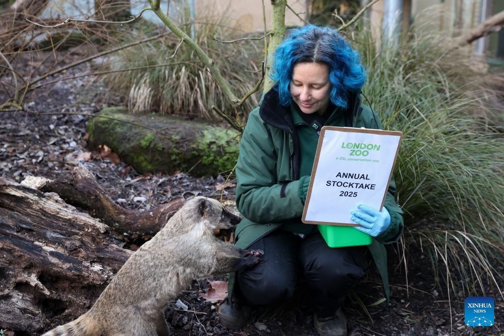 A keeper counts brown-nosed coatis during the annual stocktake at London Zoo in London, Britain, Jan. 3, 2025. (Xinhua)