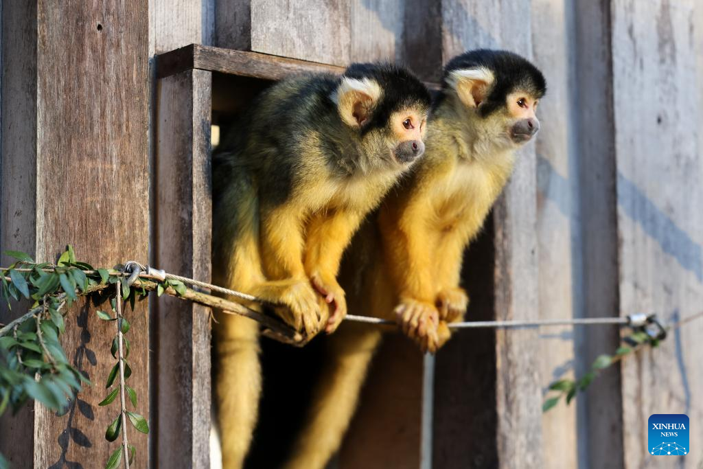 Squirrel monkeys stand during the annual stocktake at London Zoo in London, Britain, Jan. 3, 2025. (Xinhua)