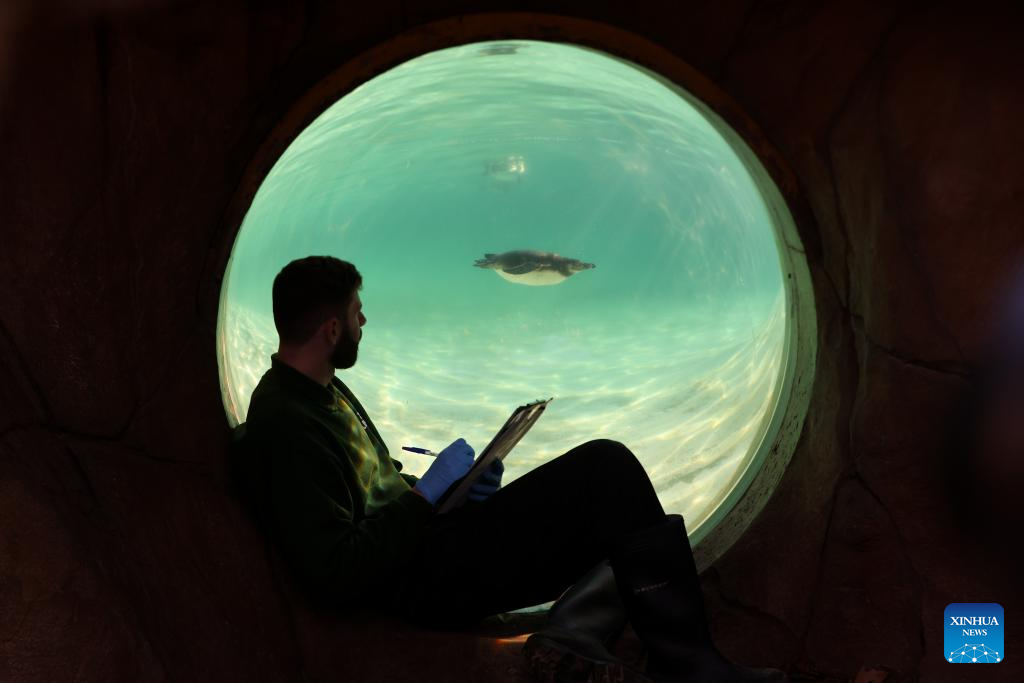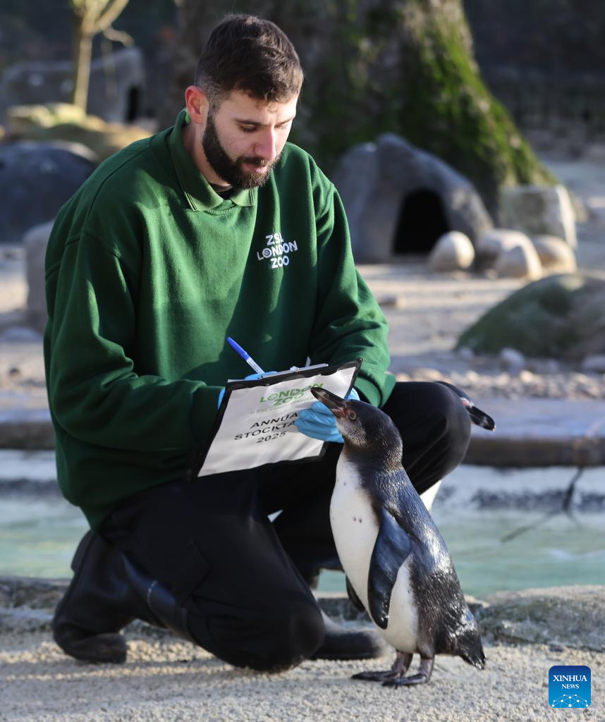 A keeper counts penguin during the annual stocktake at London Zoo in London, Britain, Jan. 3, 2025. (Xinhua)