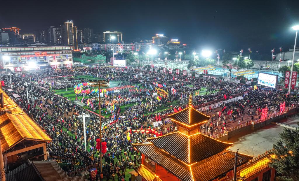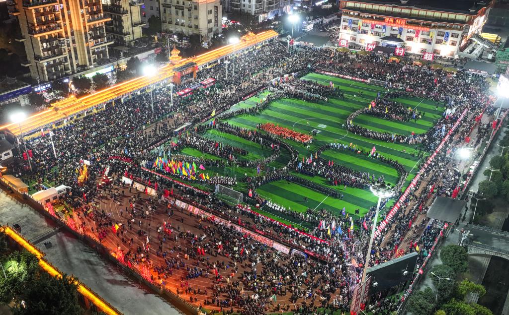An aerial drone photo taken on Jan. 4, 2025 shows the dancers performing at halftime during the opening game at the Village Super League 2025 in Rongjiang County of southwest China's Guizhou Province. (Xinhua/Yang Wenbin)