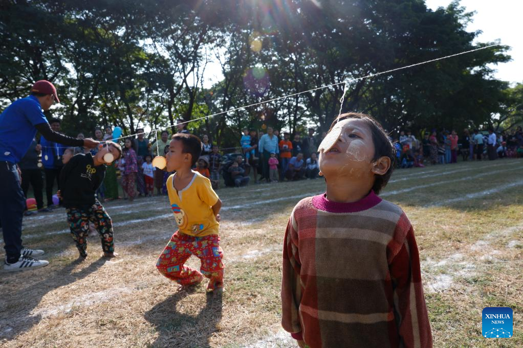 Children compete in a pillow-fighting game during an event marking the 77th Anniversary of Independence Day in Nay Pyi Taw, Myanmar, Jan. 4, 2025. Myanmar on Saturday celebrated the 77th Anniversary of Independence Day with various events being held across the country. (Xinhua/Myo Kyaw Soe)