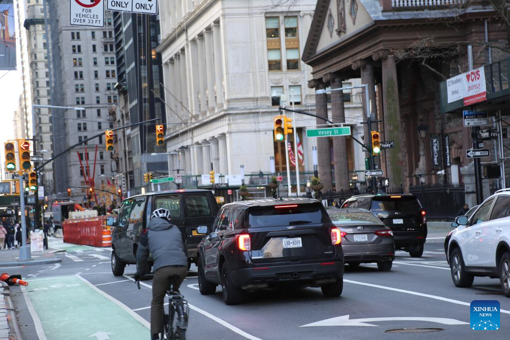 A bike rider joins the traffic in Lower Manhattan, New York City, the United States, on Jan. 3, 2025. A U.S. federal judge in New Jersey on Friday dismissed a last-minute attempt to block New York City's congestion pricing plan, allowing it to take effect Sunday. (Xinhua/Liu Yanan)