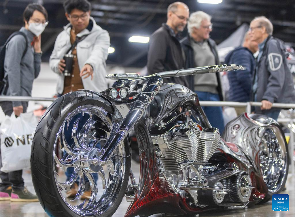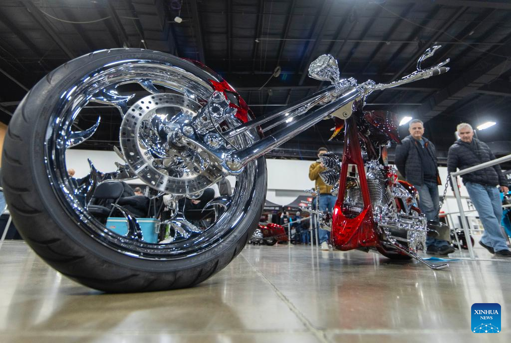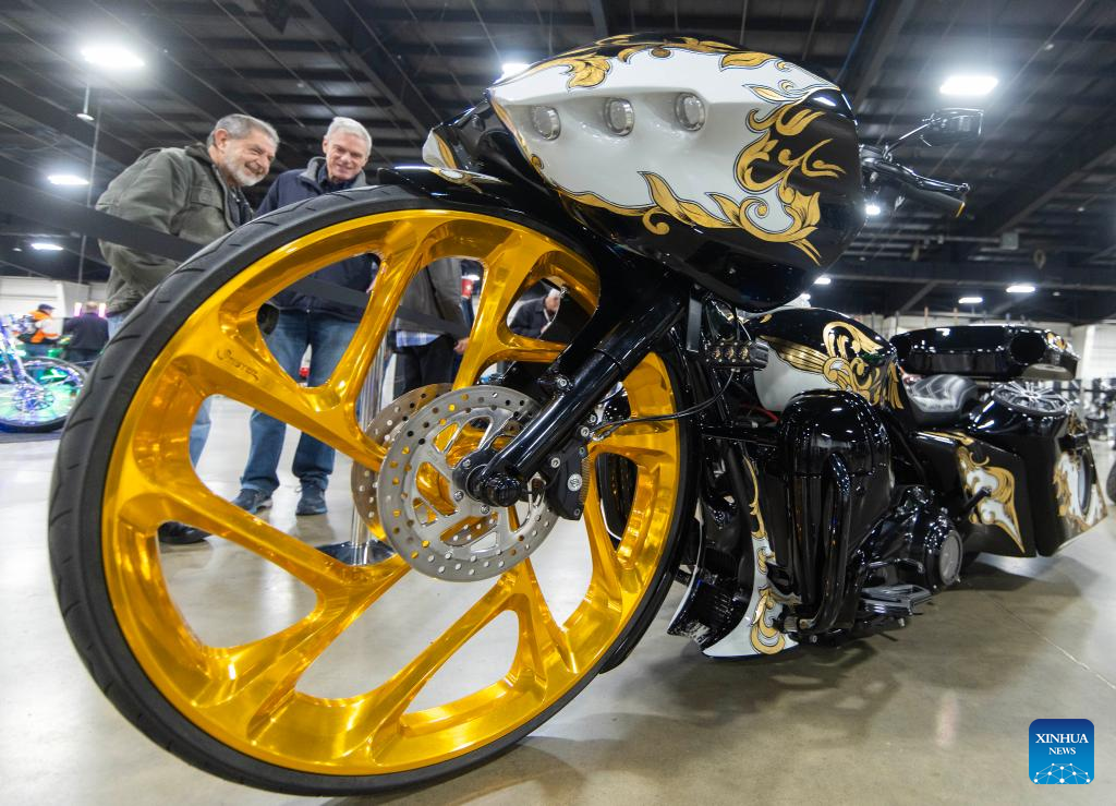 People look at a customized motorcycle during the 2025 North American International Motorcycle Supershow in Mississauga, Ontario, Canada, on Jan. 3, 2025. Featuring hundreds of motorcycles, the annual three-day event kicked off here on Friday. (Photo by Zou Zheng/Xinhua)