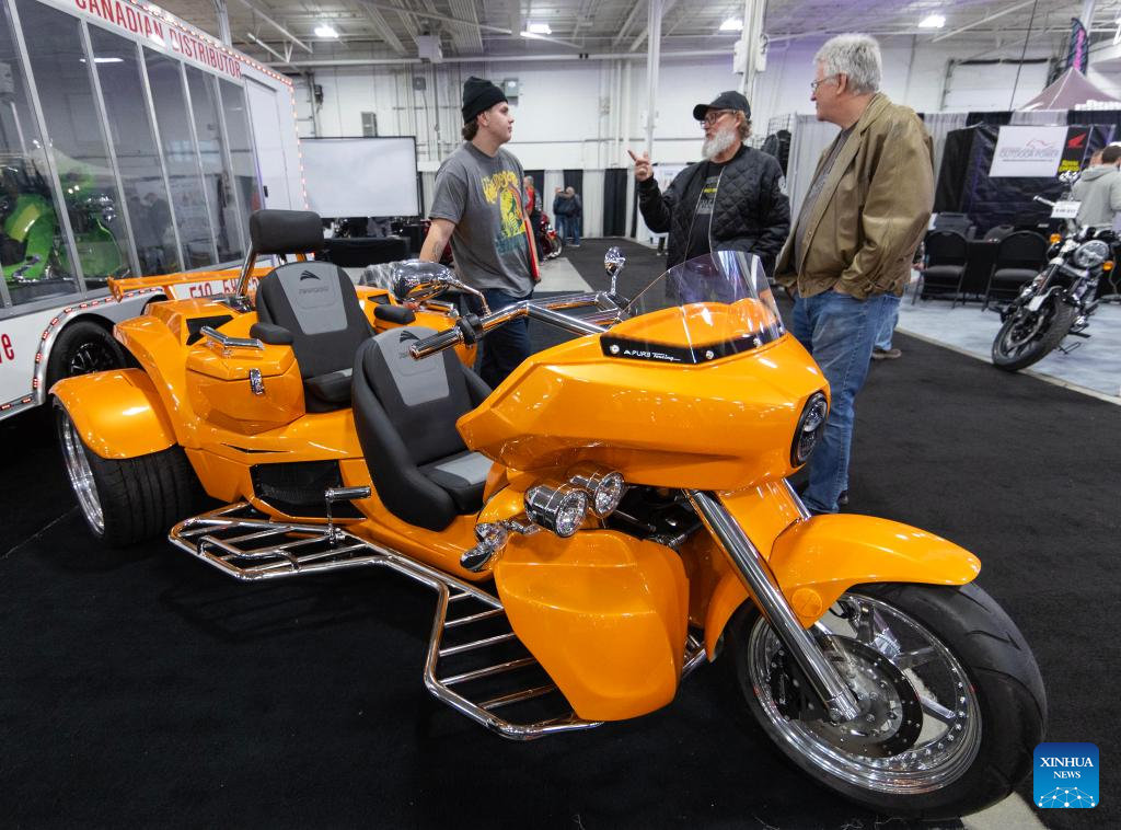 People look at a three-wheel motorcycle during the 2025 North American International Motorcycle Supershow in Mississauga, Ontario, Canada, on Jan. 3, 2025. Featuring hundreds of motorcycles, the annual three-day event kicked off here on Friday. (Photo by Zou Zheng/Xinhua)