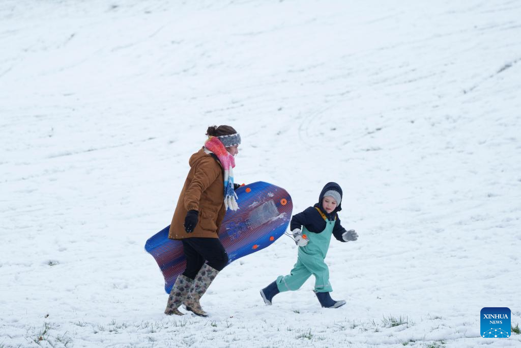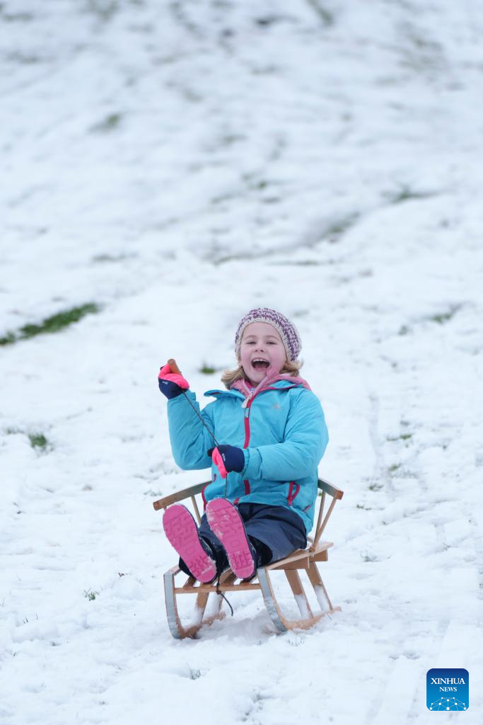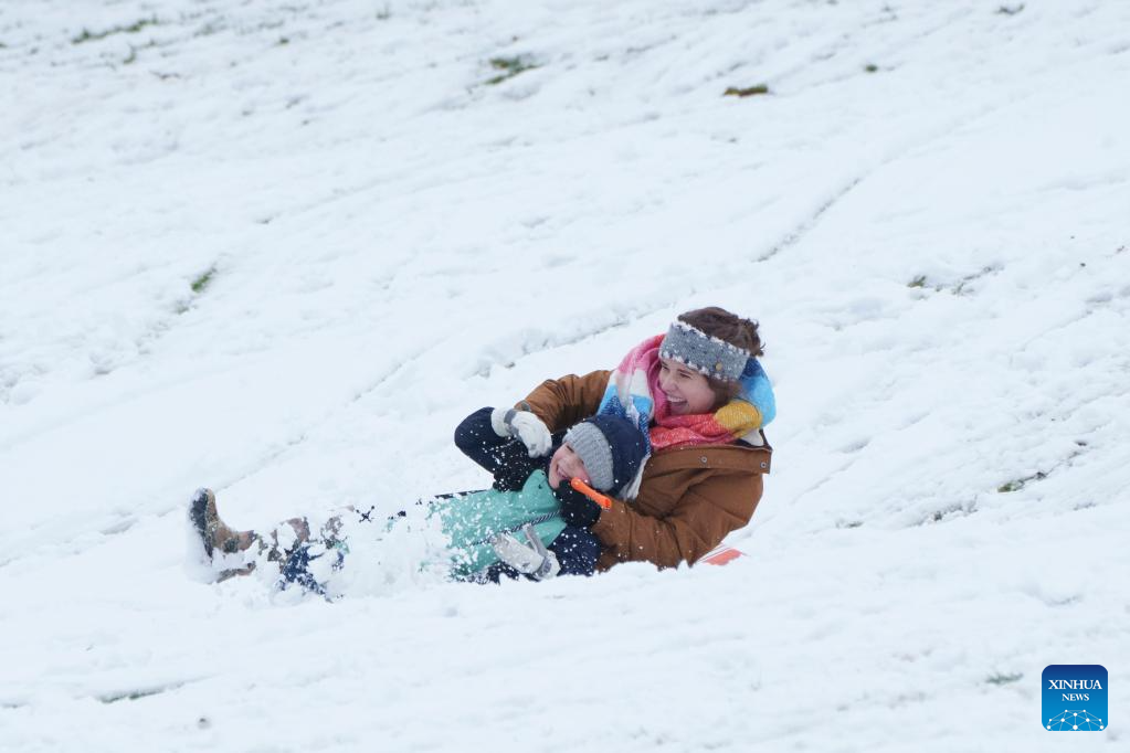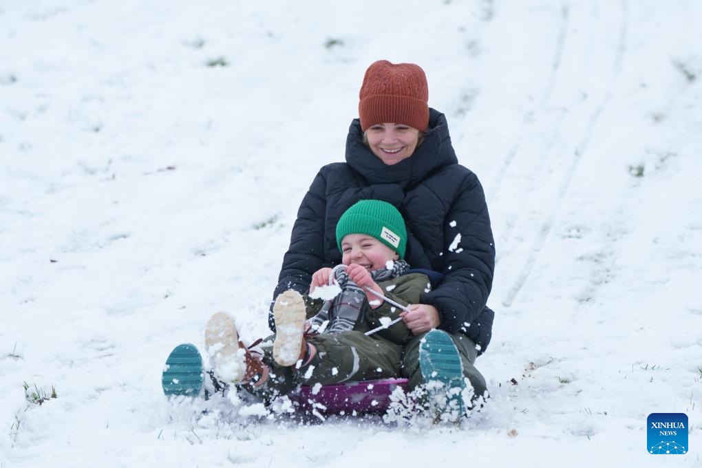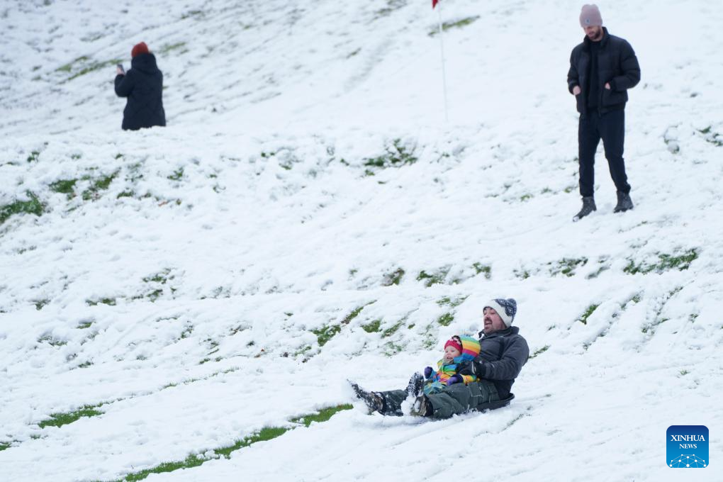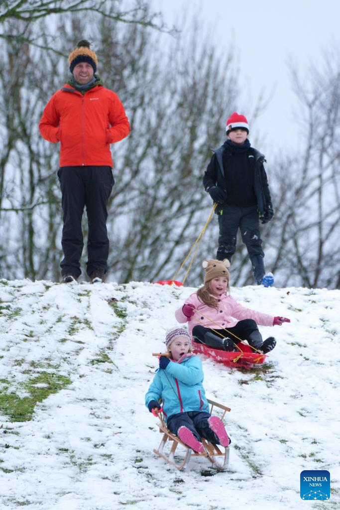 People enjoy sledding in the snow in Manchester, Britain, on Jan. 5, 2025.
