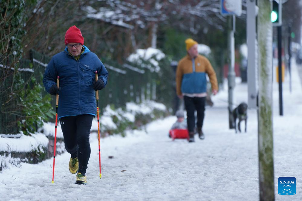 LONDON, Jan. 5 (Xinhua) -- Heavy rain and snow swept across Britain and Ireland overnight, causing travel disruptions and power cuts, with weather warnings in place on Sunday.