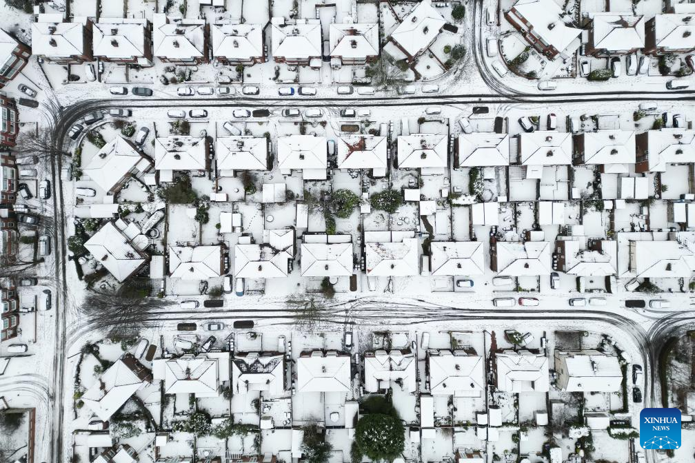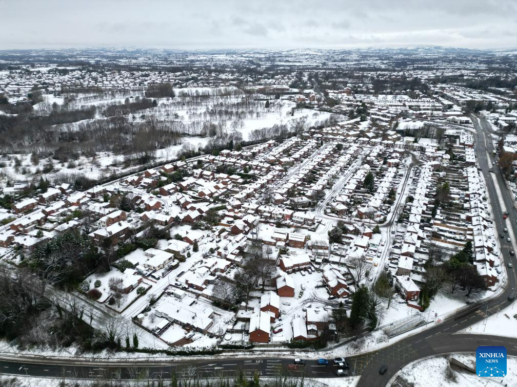 An aerial drone photo taken on Jan. 5, 2025 shows houses covered by snow in Manchester, Britain.