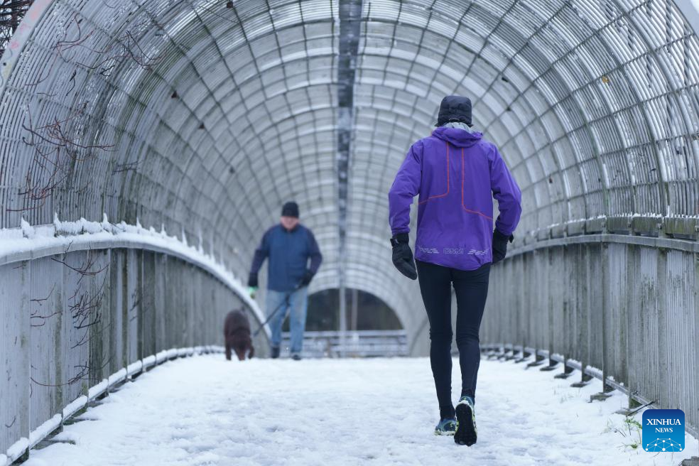 People cross a snow-covered footbridge in Manchester, Britain, on Jan. 5, 2025.
