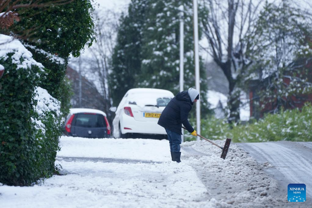 A man clears a path by a snow-covered road in Manchester, Britain, on Jan. 5, 2025.