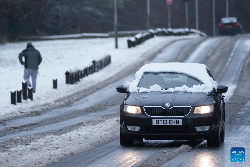 Traffic is seen on a snow-covered road in Manchester, Britain, on Jan. 5, 2025. (Photo by Jon Super/Xinhua)