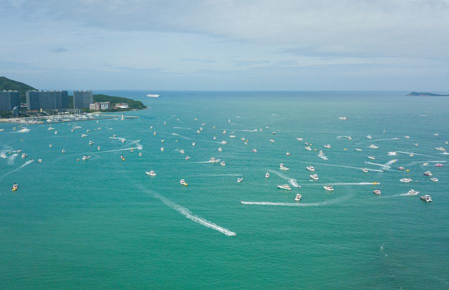 An aerial drone photo taken on July 23, 2024 shows tourists taking yachts in Sanya, south China's Hainan Province. (Xinhua/Pu Xiaoxu)