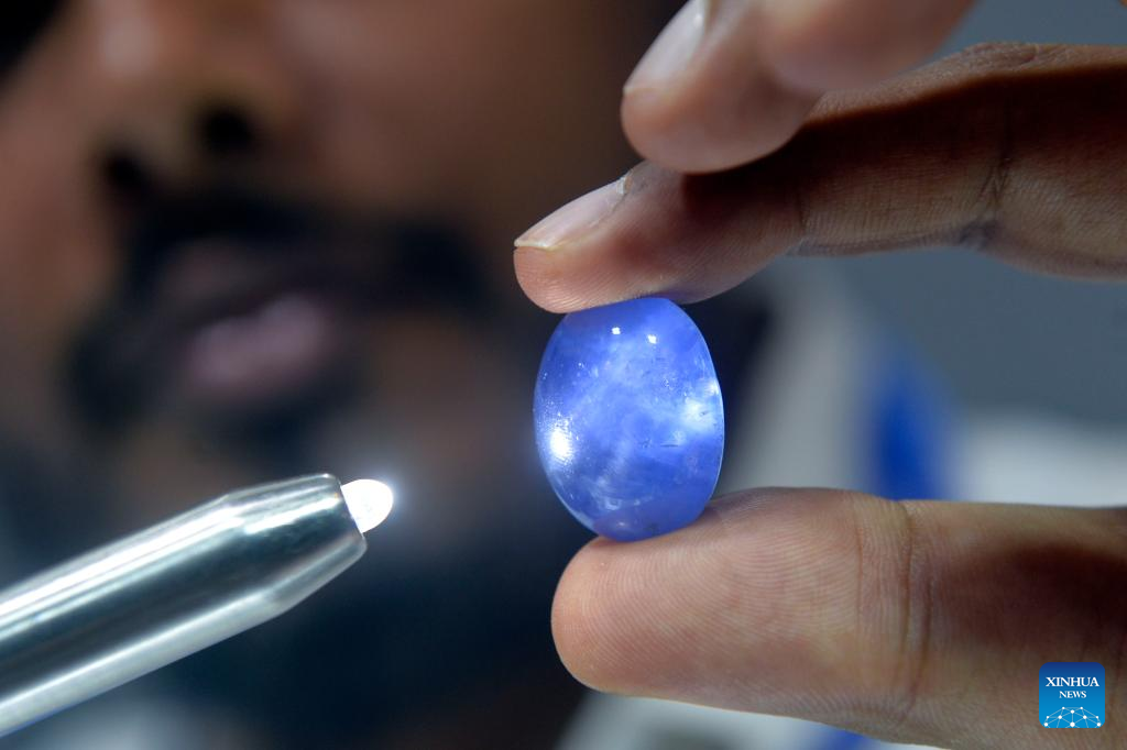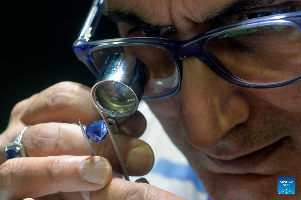 A man checks a gemstone on display during FACETS Sri Lanka 2025, an international gem and jewellery exhibition, in Colombo, Sri Lanka, Jan. 4, 2025. The exhibition opened here Saturday. (Photo by Gayan Sameera/Xinhua)