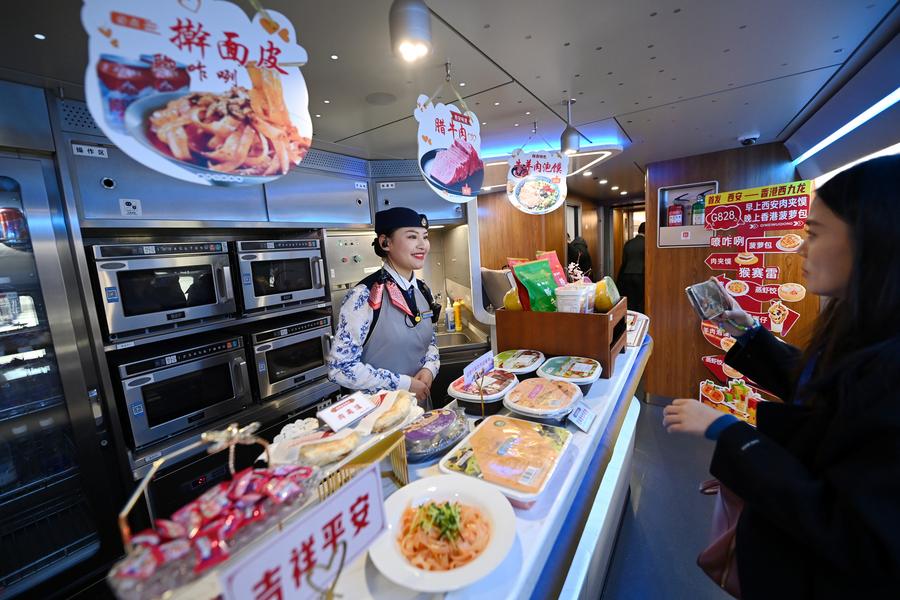 This photo shows the high-speed train G828 bound for Hong Kong pulling out of Huashan North Railway Station in Weinan City, northwest China's Shaanxi Province, Jan. 5, 2025. (Xinhua/Li Yibo)Staff members dressed in traditional costumes perform during a launch ceremony for a direct high-speed train service from Xi'an to Hong Kong at Xi'an North Railway Station in Xi'an, northwest China's Shaanxi Province, Jan. 5, 2025. (Xinhua/Li Yibo)A passenger of the train G828 bound for Hong Kong takes a video before boarding the train at Xi'an North Railway Station in Xi'an, northwest China's Shaanxi Province, Jan. 5, 2025. (Xinhua/Li Yibo)A train attendant of a high-speed train bound for Hong Kong greets passengers at Xi'an North Railway Station in Xi'an, northwest China's Shaanxi Province, Jan. 5, 2025. (Xinhua/Li Yibo)Passengers aboard the train G828 bound for Hong Kong are pictured at Xi'an North Railway Station in Xi'an, northwest China's Shaanxi Province, Jan. 5, 2025. (Xinhua/Li Yibo)A train attendant introduces the service in the dining coach of a high-speed train bound for Hong Kong in Xi'an, northwest China's Shaanxi Province, Jan. 5, 2025. (Xinhua/Li Yibo)Train attendants of a high-speed train service from Xi'an to Hong Kong prepare to work at Xi'an North Railway Station in Xi'an, northwest China's Shaanxi Province, Jan. 5, 2025. (Xinhua/Li Yibo)A staff member, dressed in traditional costume, greets passengers of the train G828 bound for Hong Kong, at Xi'an North Railway Station in Xi'an, northwest China's Shaanxi Province, Jan. 5, 2025. (Xinhua/Li Yibo)■