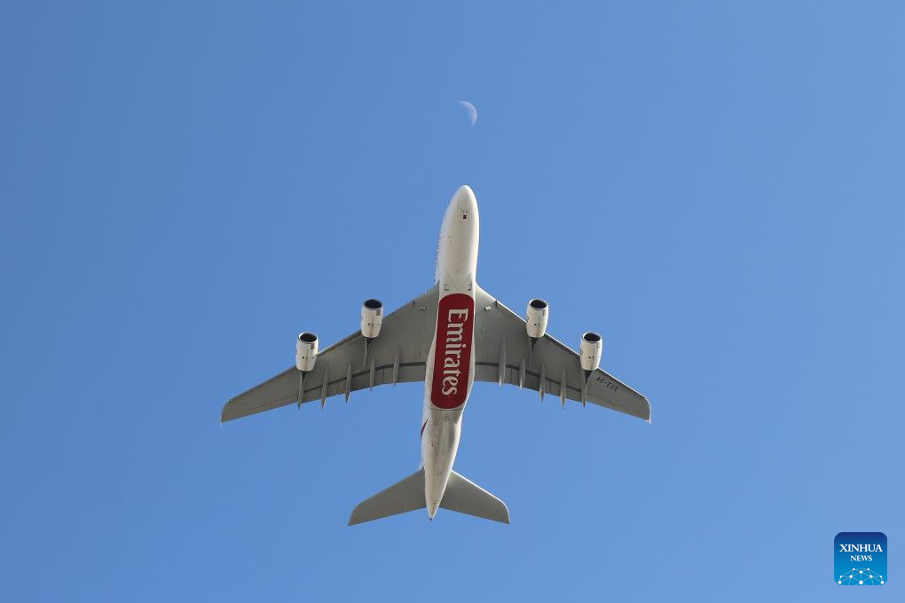This photo taken on Jan. 5, 2025 shows an airplane of Emirates Airline flying in the sky. The United Arab Emirates (UAE) recorded over one million air traffic movements in 2024, hitting a new high, the country's General Civil Aviation Authority (GCAA) announced Monday. (Xinhua/Wen Xinnian)