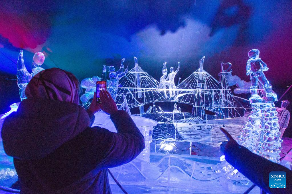 People visit an ice sculpture festival held at the Peter and Paul Fortress in St. Petersburg, Russia, Jan. 5, 2025. The event kicked off here on Jan. 1 and will be open to the public until Jan. 14. (Photo by Irina Motina/Xinhua)