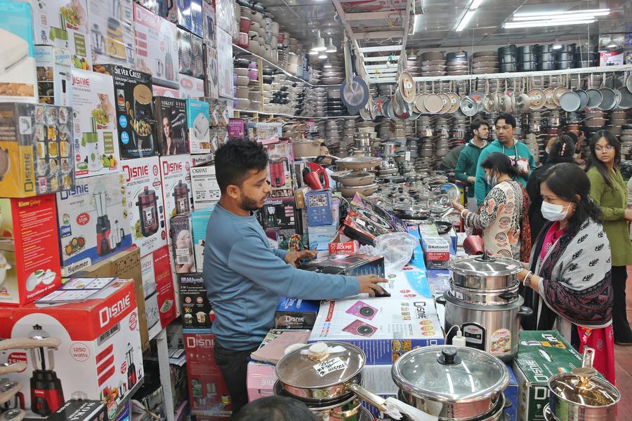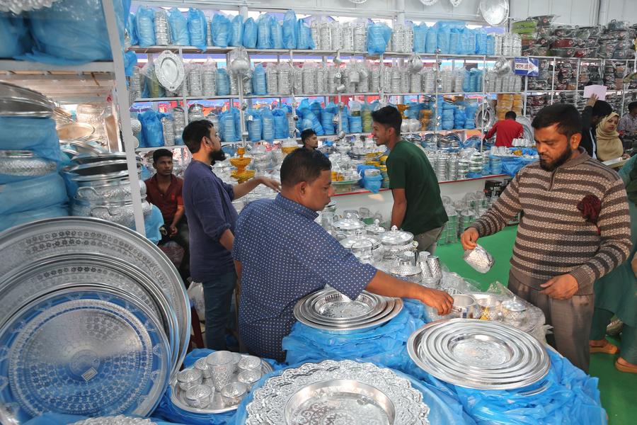 People buy tableware during the 29th Dhaka International Trade Fair in Dhaka, Bangladesh, Jan. 4, 2025. (Photo by Habibur Rahman/Xinhua)