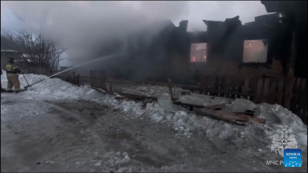 A screenshot from a video shows rescue work underway after a fire broke out in Kirov region, Russia, Jan. 5, 2025. Eight people were killed after a fire broke out in a wooden apartment building in Russia's western Kirov region, the Russian Ministry of Emergency Situations (EMERCOM) said Sunday. The EMERCOM teams are investigating the cause of the fire. (EMERCOM/Handout via Xinhua)