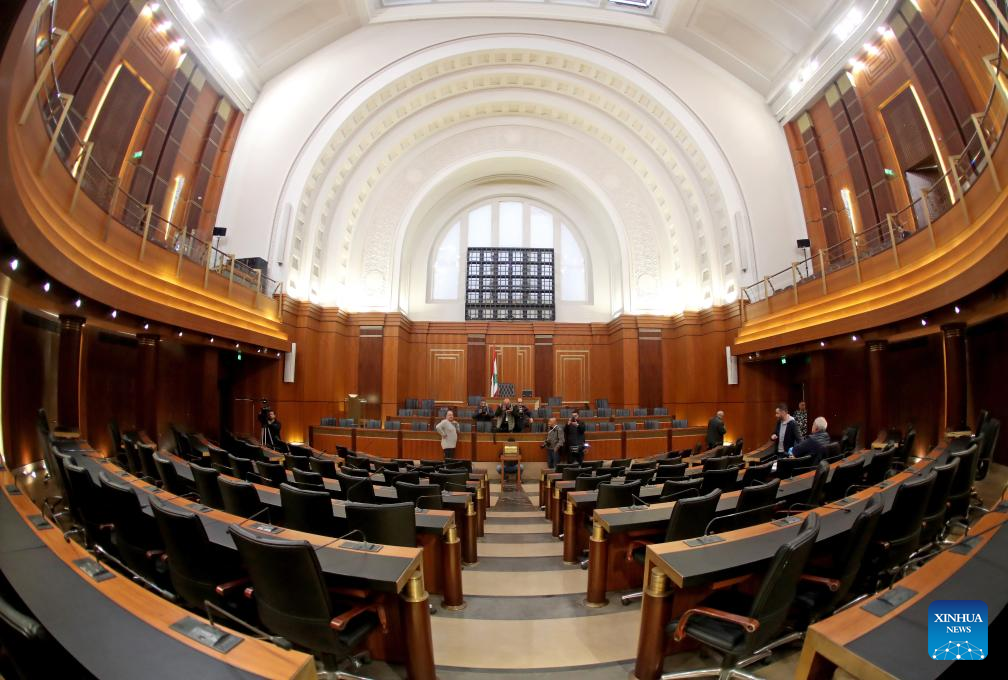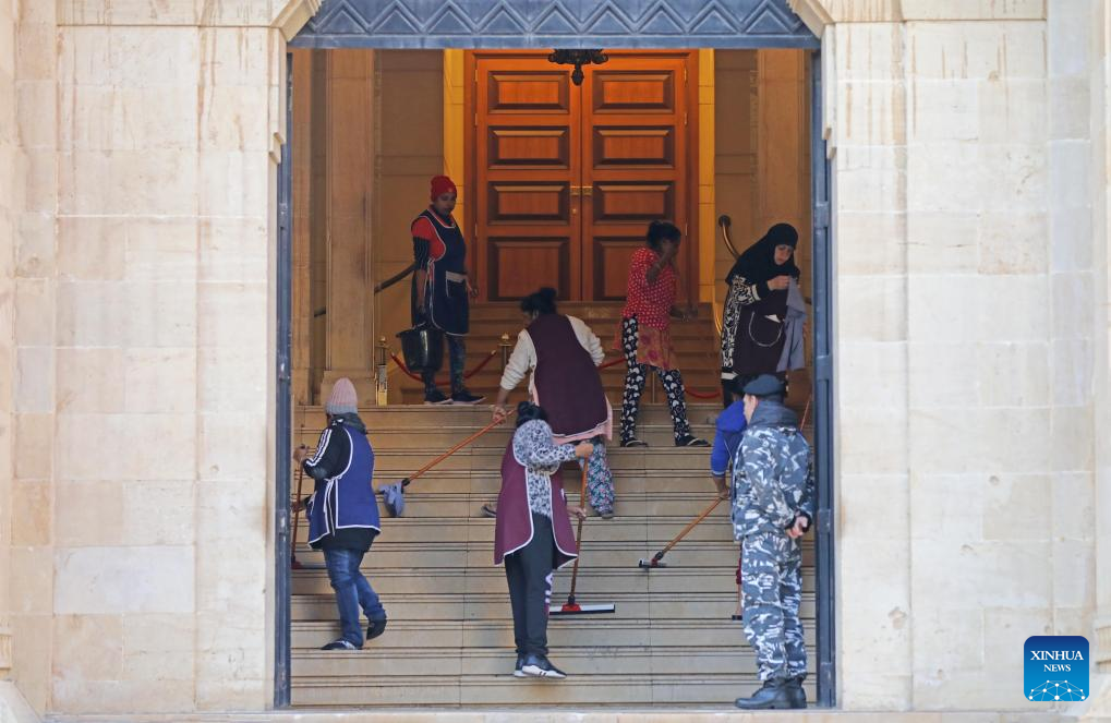 Workers clean the Parliament in preparation for the session to elect a president in Beirut, Lebanon, Jan. 8, 2025. Lebanon's Speaker of Parliament, Nabih Berri, on Tuesday called for a general session to be held on Thursday to elect a president for the republic. Since the end of former President Michel Aoun's term on Oct. 31, 2022, Lebanon has been in a presidential vacancy due to political division. The parliament failed to elect a president for the country in 12 electoral sessions. A caretaker government has been running the country amid the presidential vacuum. Lebanon needs a president to ratify any laws that parliament passes and unlock aid from the international community. (Xinhua/Bilal Jawich)