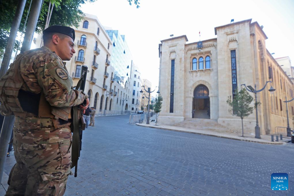 A soldier guards outside the Parliament in Beirut, Lebanon, Jan. 8, 2025. Lebanon's Speaker of Parliament, Nabih Berri, on Tuesday called for a general session to be held on Thursday to elect a president for the republic.