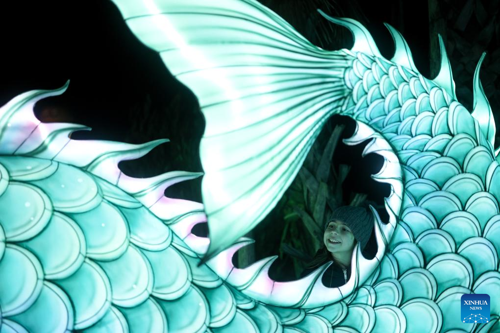 A girl looks at a light installation during a Chinese lantern exhibition at a park in Rome, Italy, Jan. 6, 2025. (Xinhua/Li Jing)