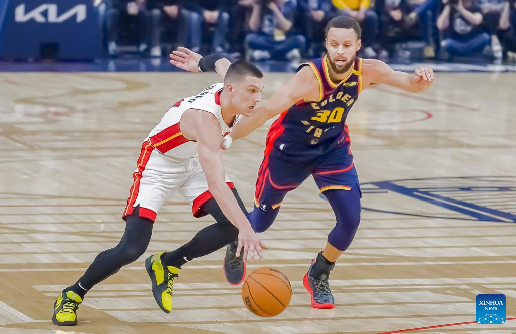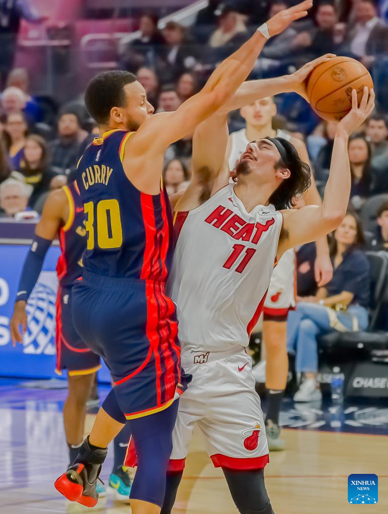 Stephen Curry (L) of Golden State Warriors competes during the NBA regular season game between Golden State Warriors and Miami Heat in San Francisco, the United States, Jan. 7, 2025. (Photo by Arthur Dong/Xinhua)