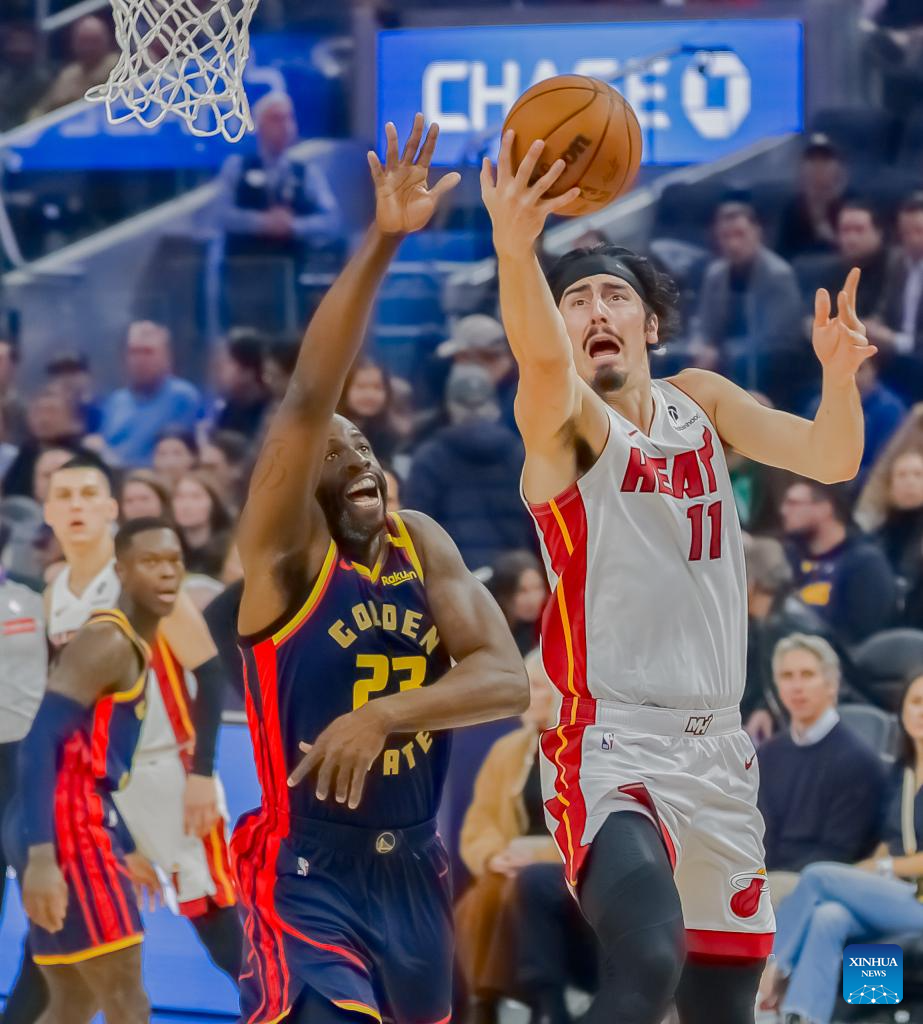 Trayce Jackson-Davis (R) of Golden State Warriors goes for a layup during the NBA regular season game between Golden State Warriors and Miami Heat in San Francisco, the United States, Jan. 7, 2025. (Photo by Arthur Dong/Xinhua)
