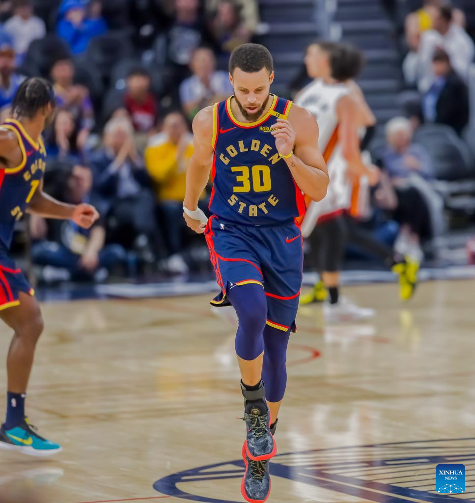 Stephen Curry of Golden State Warriors reacts during the NBA regular season game between Golden State Warriors and Miami Heat in San Francisco, the United States, Jan. 7, 2025. (Photo by Arthur Dong/Xinhua)