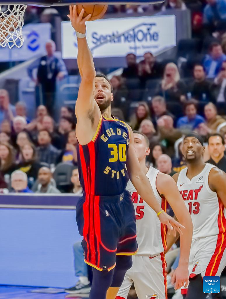 Stephen Curry (top) of Golden State Warriors goes for a layup during the NBA regular season game between Golden State Warriors and Miami Heat in San Francisco, the United States, Jan. 7, 2025. (Photo by Arthur Dong/Xinhua)
