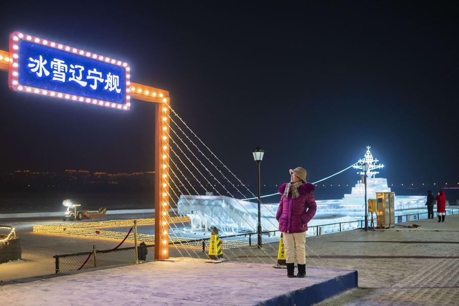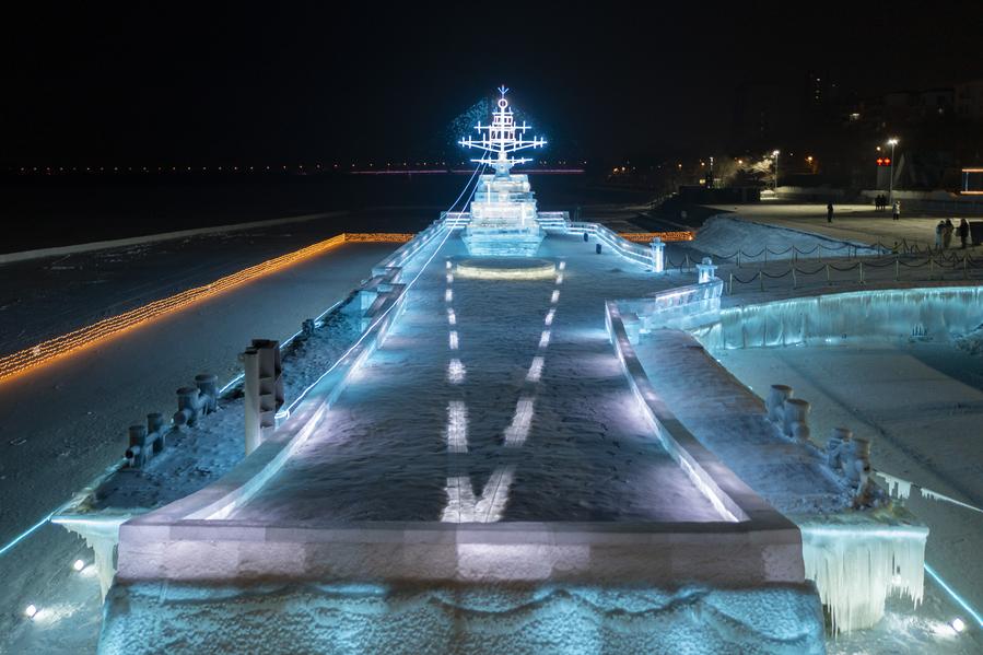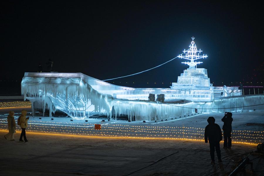 Ice sculpture inspired by Chinese aircraft carrier Liaoning debuts in Harbin-Xinhua