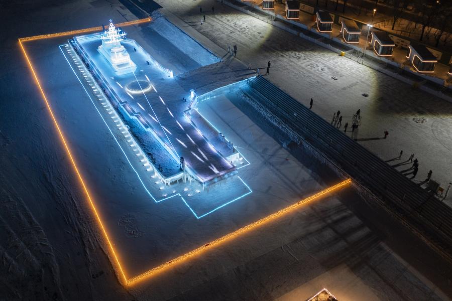 A drone photo shows an ice sculpture inspired by the Chinese aircraft carrier Liaoning on display in Daowai District of Harbin City, northeast China's Heilongjiang Province, Jan. 7, 2025. (Xinhua/Xie Jianfei)