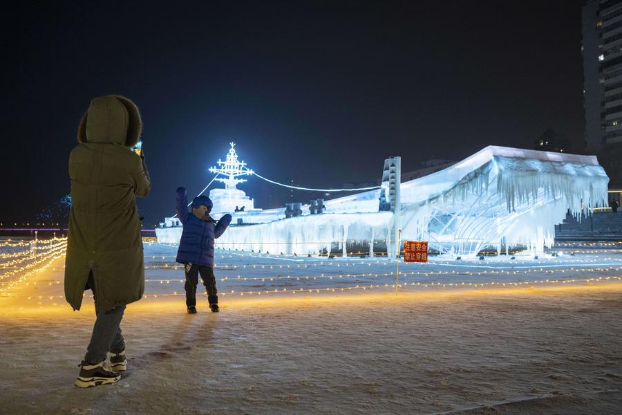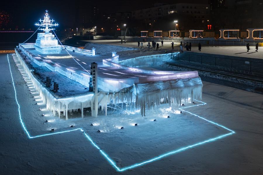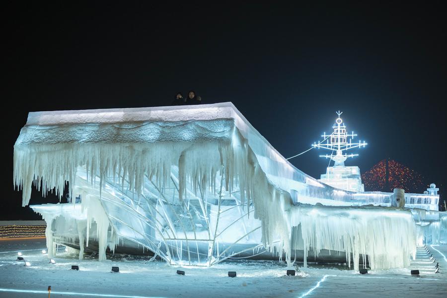 Ice sculpture inspired by Chinese aircraft carrier Liaoning debuts in Harbin