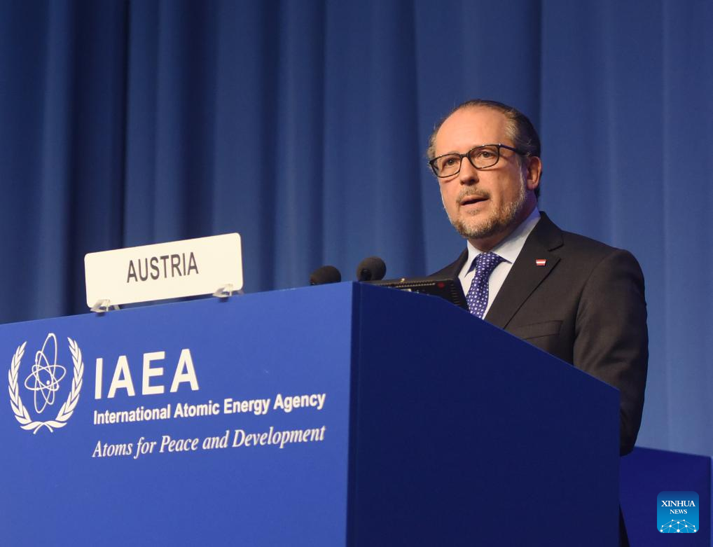 File photo taken on Sept. 25, 2023 shows Austrian Foreign Minister Alexander Schallenberg speaking at the 67th General Conference of the International Atomic Energy Agency (IAEA) in Vienna, Austria. Austrian Foreign Minister Alexander Schallenberg will serve as the country's interim chancellor following Karl Nehammer's recent resignation from the post, Austrian news agency APA reported on Jan. 8, 2025. (Xinhua/He Canling)