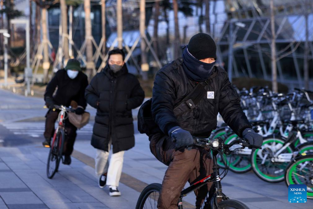 People wearing thick clothes are pictured on a street in Seoul, South Korea, Jan. 9, 2025. South Korea witnessed a sharp drop in temperature, with the lowest temperature in Seoul reaching minus 17 degrees Celsius. (Photo by Park Jintaek/Xinhua)